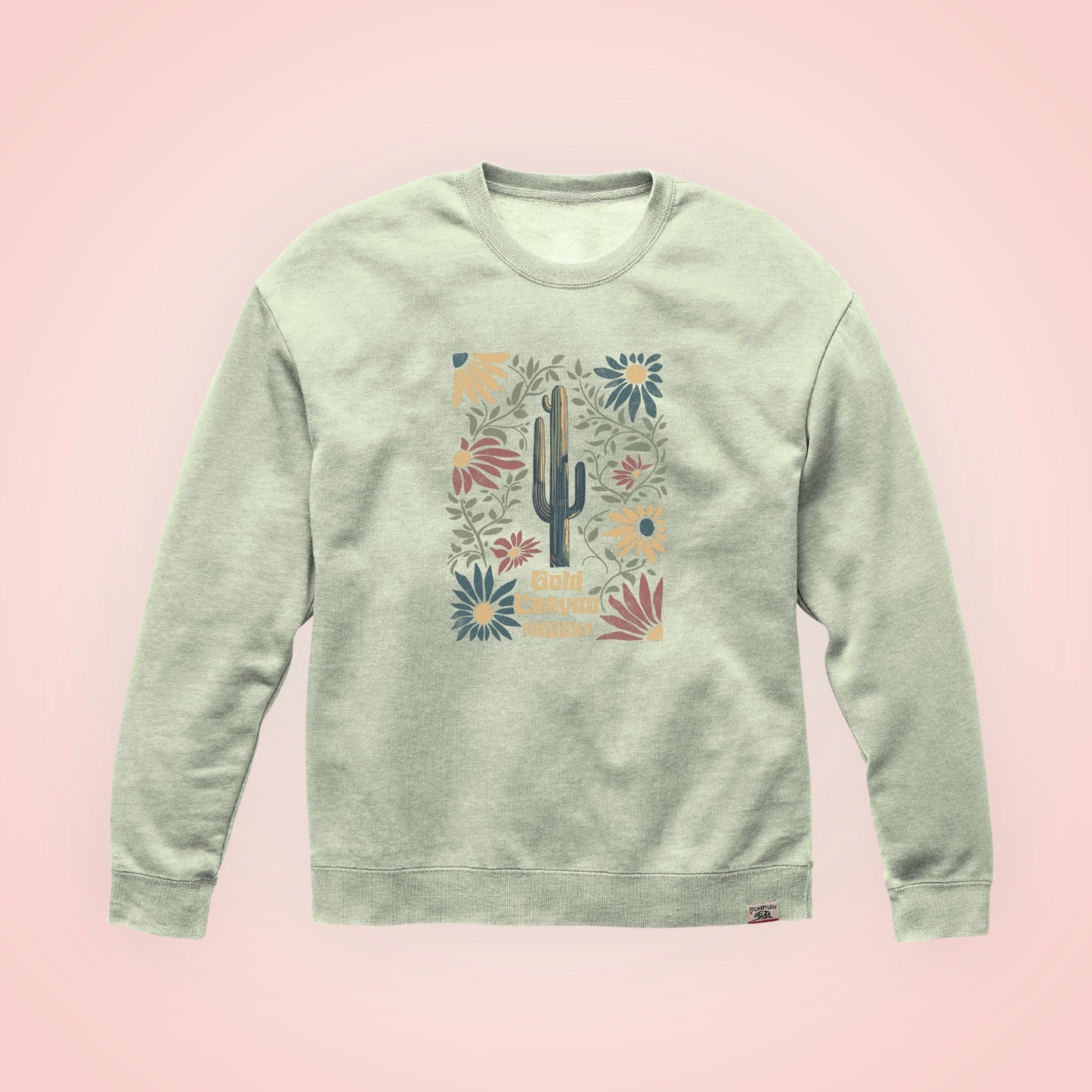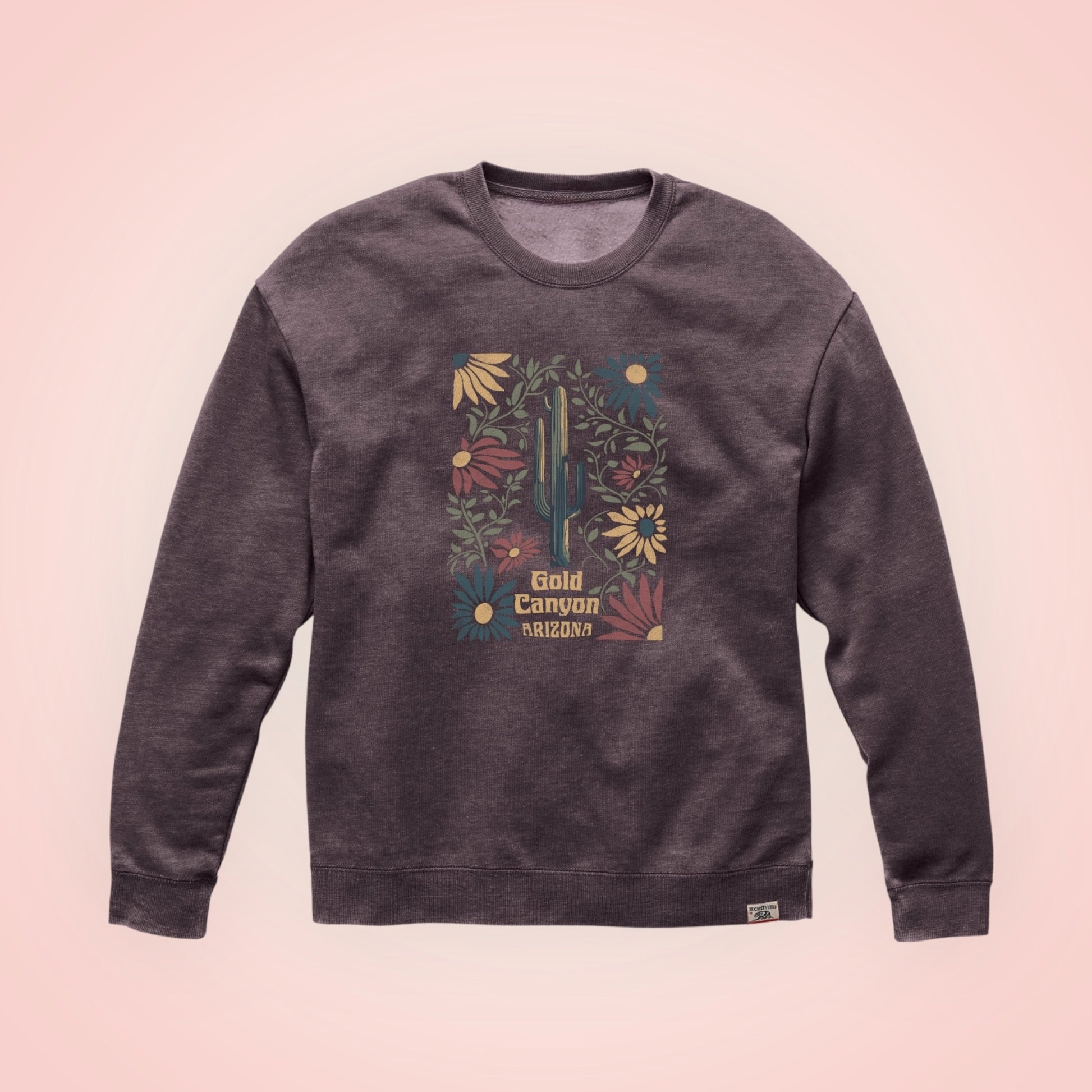 Embrace the spirit of the desert with your weathered crew Illuminated Cactus sweatshirt. Featuring earthy tones, sunny flower accents, and inspired by Gold Canyon’s iconic saguaro cactus, this soft and supple sweatshirt wraps you in cozy comfort while sparking your desert daydreams. Perfect for adding a playful touch to your everyday look.